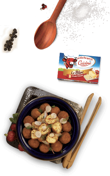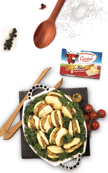 أدخلي البطاطس للفرن حتى تصبح لينة، قشريها و اطحنيها في طحانة الخضر. ضعي البطاطس المطحونة في مقلاة فوق النار حتى تجف كليا من الماء, خارج النار، أضيفي أصفر البيض، الزبدة و جبنة البلوك ®La Vache qui rit.
