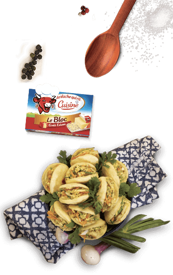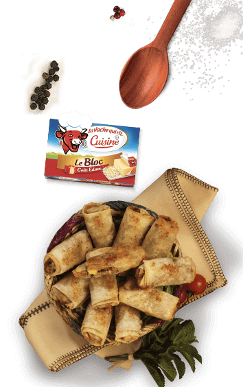 قطعي ورق البسطيلة على شكل طولي، ضعي حشوة القمرون و البسباس، قطعي جبنة البلوك ®La Vache qui rit لفي ورقة البسطيلة على شكل بريوات ثم اقليها.