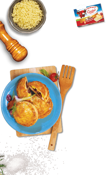 ضعي طبقة رقيقة من مفروم الطماطم و الخضر المشوية فوق حلقة العجين المورق ثم أضيفي جبنة البلوك ®La Vache qui rit المحكوكة. غطي الحلقة الأولى بحلقة أكبر من العجين المورق و ادهني بأصفر البيض ثم أدخليها الفرن على درجة حرارة 180° لمدة 20 دقيقة.